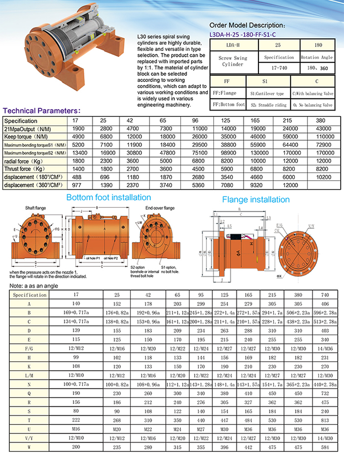L30系列螺旋擺動油缸具有高度的經(jīng)久耐用,選型靈活通用,本產(chǎn)品與進(jìn)口件可以1:1復(fù)換使用,并根據(jù)工況可以選擇缸體材質(zhì),適應(yīng)各種工況條件。